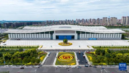 这是8月28日拍摄的2025年上海合作组织峰会主会场外景(无人机照片)。