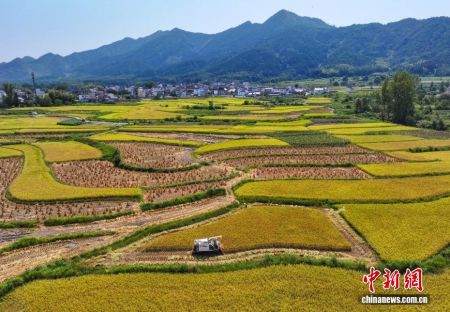 9月6日,白露节气将至,安徽省黄山市黟县碧阳镇关麓村的水稻陆续成熟,农民抢抓晴好天气进行收割,田间地头一派繁忙景象。(无人机照片