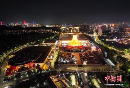 9月15日晚,从高空俯瞰广西南宁,城市各处灯光交织变换,高楼、地标建筑以壮观的灯光秀绘就璀璨画卷,迎接即将到来的第22届中国—东盟博览会、中国—东盟商务与投资峰会。(无人机照片 中新社记者 陈冠言 摄)