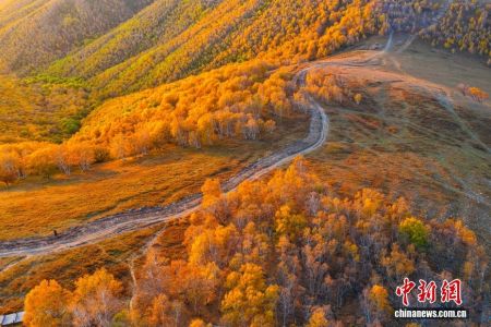 2025年9月26日,内蒙古赤峰黄岗梁秋意正浓,山林被金黄、橙红等色彩晕染,蜿蜒道路穿梭其间,宛如大自然绘就的绝美画卷,美不胜收。(