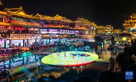 10月1日晚,在四川省眉山市东坡区无忧城水街,游客在观看演出《东坡奇妙游》。