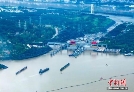 2025年前三季度,三峡枢纽累计通过量达12832.18万吨,同比增长11.15%。三峡船闸和三峡升船机作为三峡水利枢纽工程永久通航建筑物,二者优势互补、联合运行,形成了“大船爬楼梯、小船坐电梯”的独特通航格局,充分释放航运效能,助力长江黄金水道发挥“黄金效益”。图为10月3日,船舶有序通过三峡船闸。(无人机照片 周仕伟 摄)