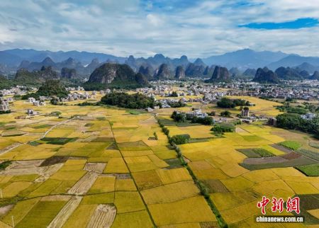10月23日,在广西贺州市平桂区黄田镇英石村,广袤的田园里稻浪翻涌,农民抢抓有利天气收割晚稻,一幅壮美的秋收画卷徐徐展开。