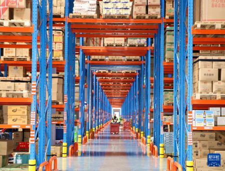 11月11日,在河南省南阳市万德隆大型综合产业园物流配送中心,工人在仓库运送商品。