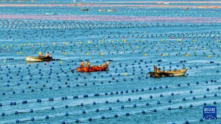 11月19日,在山东省荣成市爱伦湾海带养殖区,工人进行海带播苗作业(无人机照片)。