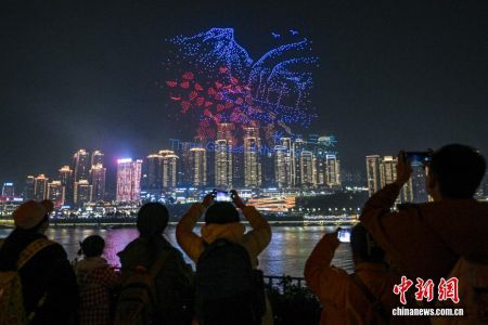 11月27日,亚洲文化遗产保护联盟第二届大会在重庆举行。当晚,“新韵重庆”无人机灯光秀亚洲文化遗产主题专场展演在重庆两江交汇的夜空璀璨上演。数千架无人机以天为幕,依次演绎“亚洲文化遗产保护联盟”标识、长江三峡、白鹤梁题刻、大足石刻千手观音、川剧变脸等图案,用科技与艺术绘就了一幅文明交流互鉴的美好画卷。图为无人机在空中描绘长江三峡夔门和红叶景观。