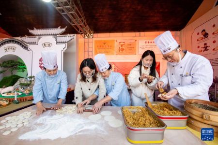 12月6日,商家在江苏省靖江市长江文化中心活动现场教学“苏味”食品制作。