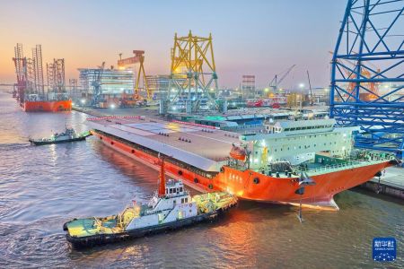 12月9日,厦金大桥(厦门段)大节段钢箱梁在江苏南通振华重装码头发运(无人机照片)。