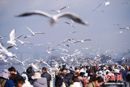 昆明气温回升 民众滇池边喂鸥赏景