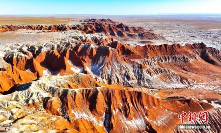 红崖台地位于内蒙古乌兰察布市四子王旗北部,山体呈现红色,随季节变化深浅交替,为典型的丹霞地貌,南北长约15公里,东西宽约10公里,当地人称“大红山”,是四子王国家地质公园的重要组成部分。隆冬时节,雪色下的红崖台地色彩浓烈,景色壮美。图为2026年1月27日拍摄的红崖台地景色。(无人机照片 图/CNSphoto 王正 摄)