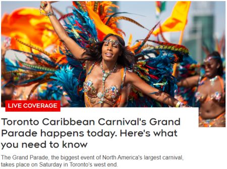 多伦多第56届年度加勒比狂欢节于7月11日拉开帷幕,并将于8月7日结束。今年节日的主题是“这的多样性生活和文化”。2023年多伦多加勒比狂欢节(Caribbean Carnival)的游行将于上午8点在展览广场的大游行中心区开始。