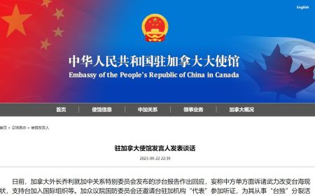 中国驻加拿大大使馆公开发表文章,称加拿大为“台独”分裂活动提供平台。中方对此强烈不满、坚决反对。