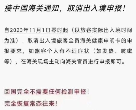 出入境中国的流程又简化了!中国海关自2023年11月1日零时起,取消出入境旅客全员海关健康申明卡的申报要求,如旅客个人有不适症状(如发热、咳嗽等),在海关现场主动向海关官员进行申报即可!