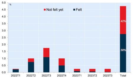 加拿大央行认为,迄今为止,加拿大经济仅受到政策加息影响的58%,单次影响最大是在2022年第三季度。值得注意的是,当时利率的4%是由于连续加息造成的。2022年3月至12月期间经历了连续加息。