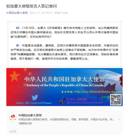 据微信公众号“中国驻加拿大使馆 ”11月20日消息,驻加拿大使馆发言人就两名加拿大间谍被捕答记者问。11月18日,加拿大《环球邮报》援引有关消息人士的话称,加公民康明凯和迈克尔涉嫌在中国从事间谍活动。但加外交部发言人对此予以否认并再次指责中国实施“任意拘押”。你对此有何评论?