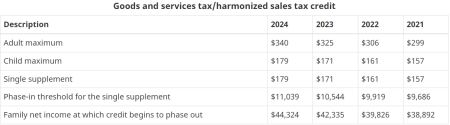 2024年联邦商品和服务税(GST/HST)抵免为: