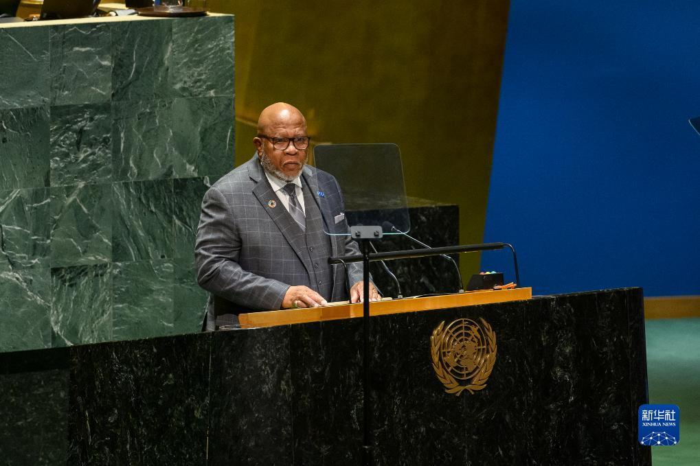 11月28日,在位于纽约的联合国总部,联大主席丹尼斯·弗朗西斯在就巴勒斯坦问题举行的年度辩论会上发表讲话。新华社发(联合国供图/洛伊·费利佩摄)