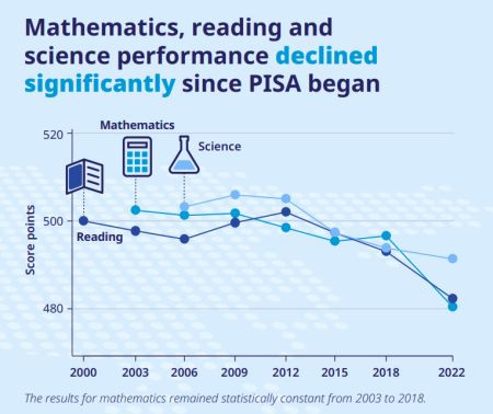 OECD教育与技能总监Andreas Schleicher在一份关于2022年PISA测试主要关注数学方面成绩的报告中写道,“虽然显而易见的是,一些国家和经济体在教育方面表现得非常出色,但总体情况更令人担忧。”