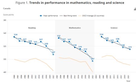“在全球PISA测试的20多年中,OECD的平均分数在连续评估之间并没有发生戏剧性的变化。但是,这20多年期间总体表现呈现出了前所未有的下降。”与上一次(2018年)测试结果相比,加拿大高中生在2022年的考试中,数学成绩低了15分,阅读降了13分,科学方面下降3分。