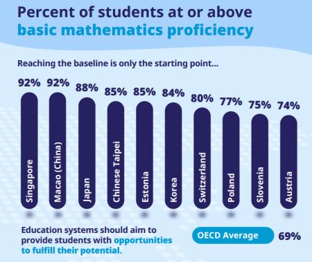新闻稿中指出,在数学方面,新加坡和其他五个东亚教育体系,澳门(中国)、中国台北、香港(中国)、日本和韩国的表现优于其他所有国家。这些国家和经济体在科学方面也是表现最好的,此外,爱沙尼亚和加拿大学生的科学成绩也较高。在阅读方面,爱尔兰的表现与日本、韩国、中国台北和爱沙尼亚一样好。