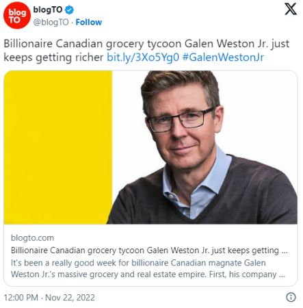 尽管他表示,接受该准则的一般概念,但Weston指出,具体条款将导致Loblaw公司的成本上升,这将转嫁给购物者。此前有报道称,他自己在2022年获得了120万加元的涨薪,其公司利润今年每个季度与去年相比已飙升了数千万加元。