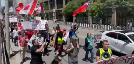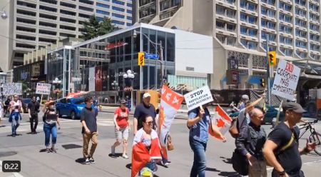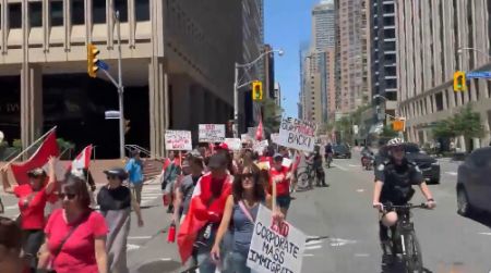 紧接着,浩浩荡荡的游行队伍走上了多伦多市中心的街头,高呼着反对特鲁多和大规模移民的口号。
