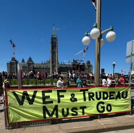 以国会山为背景的路边,还挂出了“WEF&Trudeau Must Go(WEF和杜鲁多必须下台)”的横幅。↓