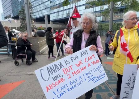 一位白发苍苍的老人在标语上写着:加拿大欢迎任何种族,但我们不能接受每年200万新移民,我根本找不到家庭医生,甚至连一个工作面试的机会都没有。