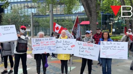 在卡尔加里,当地居民们聚在一起,举办了一场反对移民政策的小型集会。