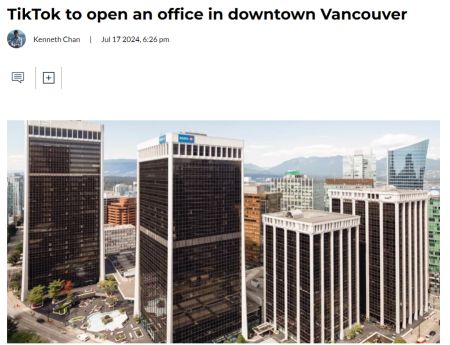 其实TikTok在温哥华之前就有“办事处”,地址是777 Dunsmuir St,和其他公司共享,所以人们普遍不是很清楚。在2024年初,TikTok就已经宣布要在美国、加拿大、澳大利亚扩大业务,尽管当时美国对其的制裁已经发酵,但并没有阻碍TikTok的规划。