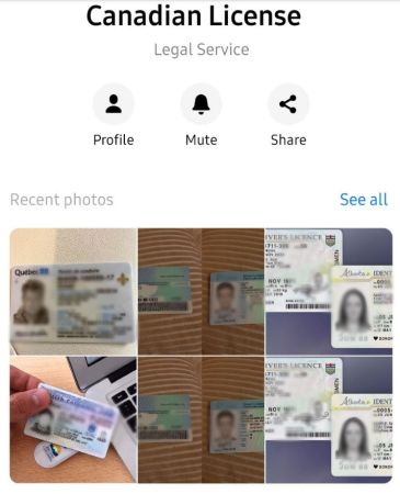 此外,他们还出售假枫叶卡和签证。这家假证件公司的Facebook页面上有一个Telegram频道的链接,该频道声称它们“合法注册”在SAAQ、ICBC、Service Ontario等机构。