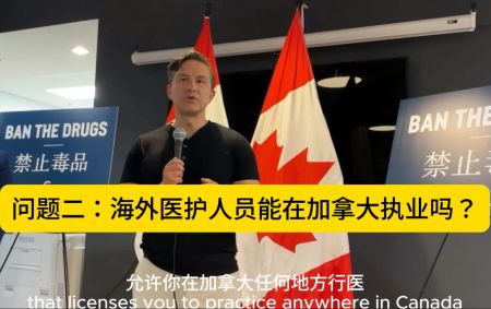 对于一位华人心脏病学医师提出的希望在加拿大继续执业、来帮助改善这里医护人员短缺的问题,博励治表示,保守党提出的Blue Seal项目,将帮助海外医护人员通过考试来获得执业资格认证,从而让他们在这里就业。