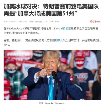 比赛当天白宫发言人Karoline Leavitt表示,她和总统特朗普都期待观看美国冰球队在周四晚的比赛击败“即将成为我们第51个州的加拿大”。