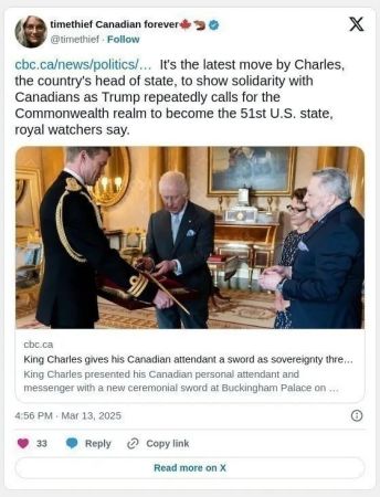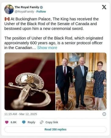 周三,查尔斯国王在白金汉宫向加拿大高级议会官员、黑杖令使者赠送了一把仪式用剑。鉴于当前加美贸易战的紧张局势以及特朗普的言论,这一仪式被许多观察人士认为具有象征意义。在与加拿大高级议员举行会晤前,国王还穿上了加拿大军队的制服,并在宫殿内种下了一棵红枫树,以纪念已故女王伊丽莎白二世对森林保护的承诺。