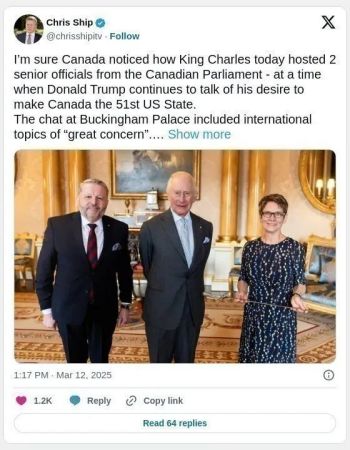 斯塔默访问美国期间,向特朗普递交了一封来自查尔斯三世的信,邀请他再次访问英国。观察人士认为,这显示了英国王室在外交上的特殊作用。政治演讲撰稿人和历史学家亚瑟·米尔内斯指出,英国君主长期以来都是加拿大总理的“倾听者”,并对外交事务有着深厚的了解。“在不确定和动荡的时期,国王是稳定的象征,也是加拿大区别于美国的标志。”米尔内斯说。他最后补充道:“唐纳德·特朗普可能想成为国王,但加拿大实际上永远都会有一个国王。”