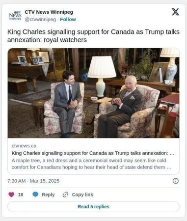 近日,美国总统唐纳德·特朗普多次提及将加拿大吞并为美国第51州,引发广泛关注。在这一背景下,英国国王查尔斯三世的一系列象征性举措被解读为对加拿大的微妙支持。