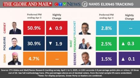 Nanos Research 首席数据科学家、CTV News 和《环球邮报》官方民意调查员Nik Nanos表示:“自由党在第一份追踪报告中的优势为 5 个百分点,而现在已达到 10 个百分点。这是在自由党领袖马克·卡尼回应特朗普‘解放日’关税声明之后发生的。”