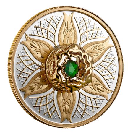 这颗有机宝石由史前海洋生物的化石贝壳切割而成,产自亚省的熊掌地质构造。更令它如此独特的是,亚省是世界上唯一一个商业开采斑彩石的地方。硬币正面的设计更为简洁,与整体主题相得益彰,镀金国王查理三世肖像,配以一朵春花,花心中央镶嵌著一颗标准级的菊石。