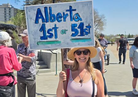 但在本周六,她出现在阿尔伯塔省议会大楼前,与数百名民众一同参加支持阿尔伯塔脱离加拿大的集会。人群中挥舞着阿尔伯塔旗,甚至有少数人挥舞着美国星条旗。
