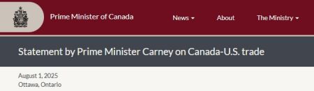 加拿大总理马克·卡尼(Mark Carney)周五(8月1日)就美国总统特朗普对部分加拿大商品施加35%关税的决定作出了回应。这项35%的关税是在此前已征收的25%关税的基础上上调,并影响那些不在《加美墨自由贸易协定》(CUSMA)下进行交易的商品。受CUSMA保护的商品可免除此项关税。