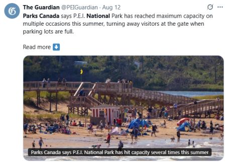 7 月下旬,爱德华王子岛国家公园宣布,该公园的游客数量和交通拥堵都达到了创纪录的水平。“这里太拥挤了,”住在公园附近并经常来玩的迈克·凯利(Mike Kelly)说。“如果你打算免费邀请全世界的人来,你就应该做好准备。”