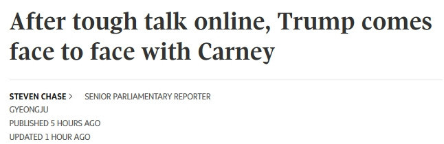 美国总统特朗普在与加拿大总理卡尼关系紧张之际,淡化了本周在韩国峰会上会面的可能性。上周,特朗普宣布中断与加拿大的贸易谈判,并威胁要对加拿大进口商品加征10%惩罚性关税。然而,尽管言辞强硬,特朗普周三晚上还是在韩国总统李在明主持的8人小型晚宴上,与卡尼面对面而坐。