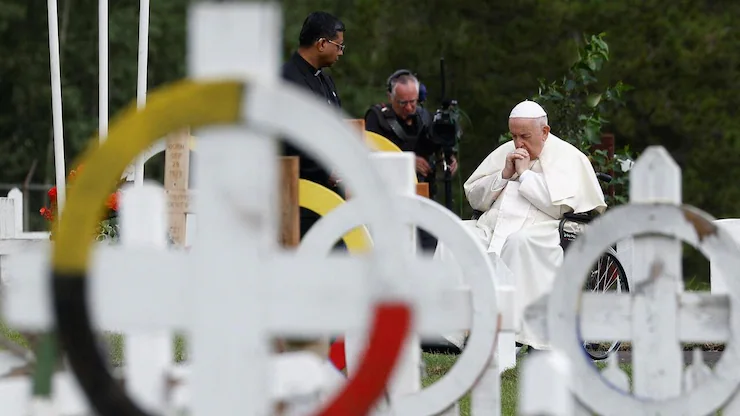2022年,已故教宗方济各(Pope Francis)在访问加拿大前夕,就天主教会在寄宿学校中所扮演的角色,向加拿大原住民做出历史性的道歉(下图)。在这些寄宿学校里,许多儿童遭受虐待,并被埋葬在无名坟墓中。