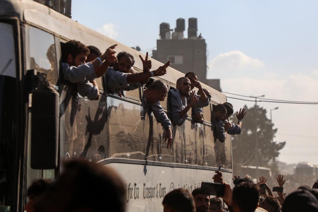 10月13日,巴勒斯坦获释人员乘坐大巴回到加沙地带南部汗尤尼斯。新华社发(里泽克·阿卜杜勒贾瓦德摄)