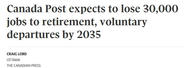 面对巨额亏损,加拿大邮政公司(Canada Post)的总裁周二表示,未来十年公司预计将有多达3万名员工通过退休或自愿离职流失,以帮助控制成本。总裁埃廷格(Doug Ettinger)在加拿大邮政年度会议上说:“未来,我们必须成为一家更精简的企业,让运营符合国家的现代需求,也符合我们的财务现实,这需要一些改变,但我们会尽量将对员工的影响降到最低。”