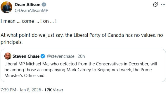 马荣铮参与此次访华行程的消息,也在其前保守党同僚中引发议论。一些人通过社交媒体表达不满。保守党议员Dean Allison在X平台上写道:“我的意思是……拜托……!到底要到什么时候,我们才会说加拿大自由党已经没有任何价值和原则了?”