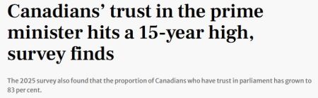按年龄划分结果还显示,18至29岁的年轻人对议会的信任度较2010年明显上升,表达高度信任的比例从12%翻倍至24%。而在60岁及以上人群中,对总理抱有高度信任的比例也高于任何其他年龄段,从2023年杜鲁多任期末的23%,大幅升至2025年年中的44%。(据51网、thestar.com)