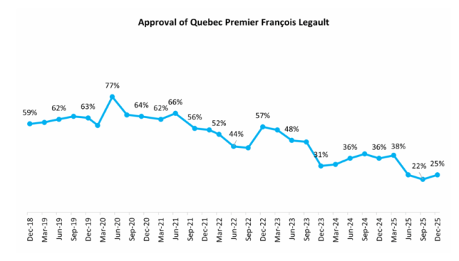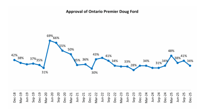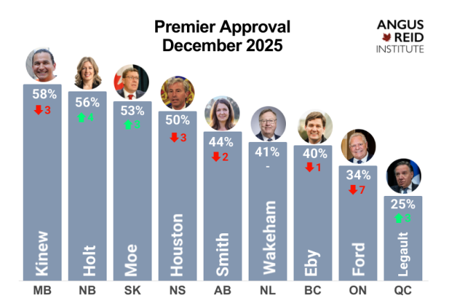 由Angus Reid Institute做的加拿大2025年最终省长支持率评估结果显示:曼省省长Wab Kinew居首,安省省长福特位列倒数第二,魁省省长Francois Legault倒数第一。