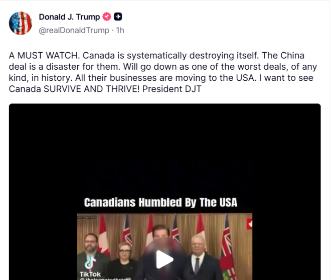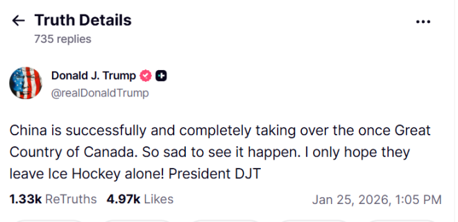 在随后的帖子中,特朗普补充说,中国正在“成功且彻底地接管曾经伟大的加拿大”,他对此感到“非常难过”。