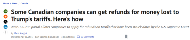“加拿大企业应尽快联系美国合作方,确认是否会提出退款申请,以及退款将如何处理,”CFIB 表示。“许多出口商以为可以自行申请,最终才发现并非如此,导致错过截止日期。”
